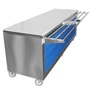 Fabricado integramente en acero inoxidable AISI 304,tablero superior de 1/16″ de espesor,01 nivel inferior de 1/20″ de espesor,base tipo gabinete con plancha de 1/27″ de espesor,garruchas giratorias Ø5″,02 con freno,con deslizador de bandejas tubular.
